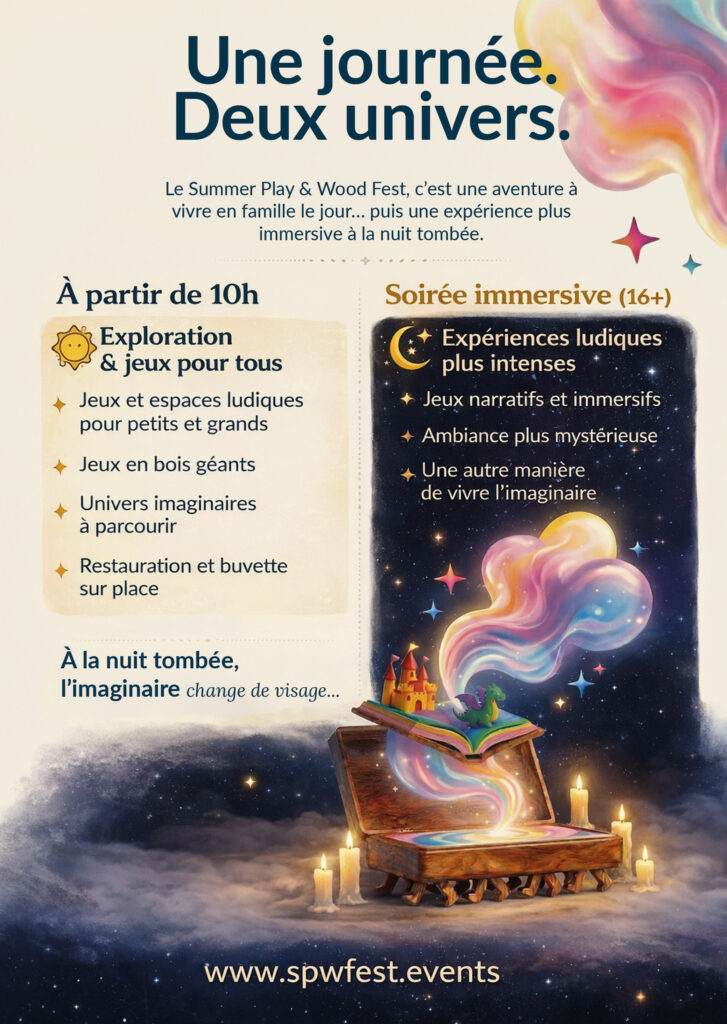 Le Summer Play & Wood Fest, c’est une aventure à vivre en famille dès 10h dans l’Archipel des Îles de Pierre — puis une expérience plus immersive à la nuit tombée pour les 16 ans et plus.